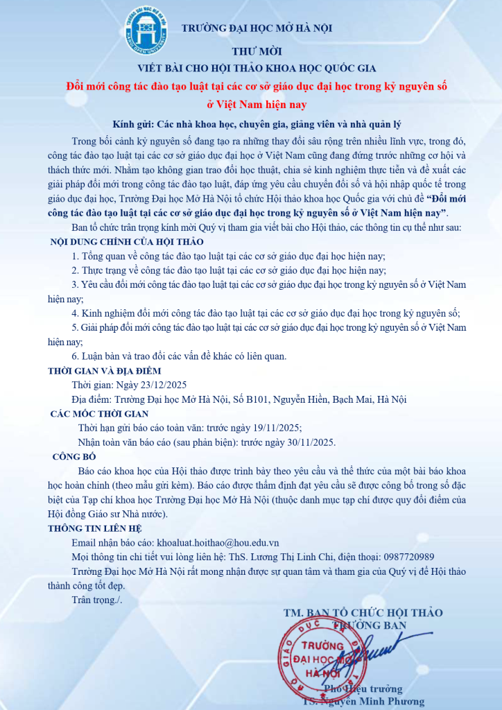 - TỌA ĐÀM KHOA HỌC TRỰC TUYẾN Chủ đề: “Nâng cao chất lượng đào tạo các học phần đặc thù ngành Luật quốc tế tại Khoa Luật – Trường Đại học Mở Hà Nội” - 28/08/2025