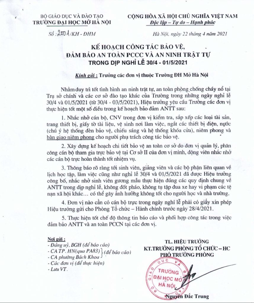 Ban lãnh đạo Khoa Luật thông báo: Kế hoạch số 2021/KH-ĐHM ngày 22 tháng 4 năm 2021 của Trường Đại học Mở Hà Nội về việc bảo vệ, đảm bảo an toàn phòng cháy chữa cháy & an ninh trật tự trong dịp nghỉ Lễ 30/4/2021 – 1/5/2021. Kính đề nghị cán bộ, giảng viên & sinh viên trong Khoa nghiêm túc thực hiện kế hoạch: