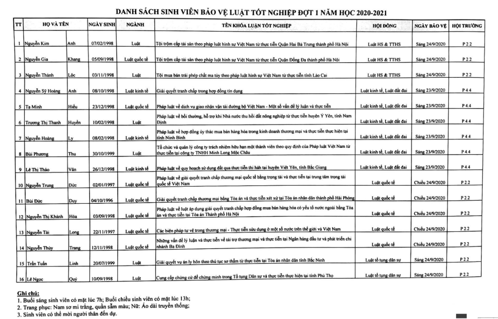 Khoa Luật thông báo lịch bảo vệ khóa luận tốt nghiệp tháng 9 năm 2020 cụ thể như sau: