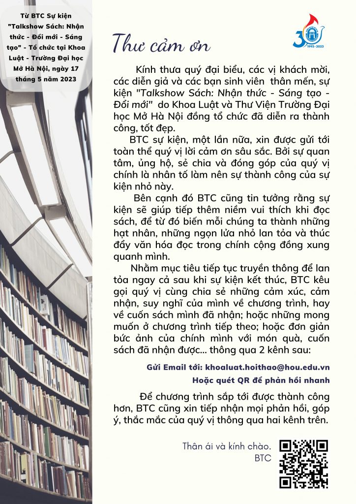 Ngày 17/5, Khoa Luật phối hợp với Thư viện tổ chức thành công talkshow “Sách: Nhận thức – Đổi mới – Sáng tạo” với sự tham gia của hơn 100 cán bộ, giảng viên,học viên và sinh viên
